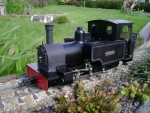 The Simply 7/8ths "Arthur" body kit is designed to fit on a standard Roundhouse Lady Anne 0-6-0 chassis. However, having acquired said body kit my customer decided he wanted something a little different, as usual. The initial thinking was to convert a Lady Anne chassis in to a 2-6-2: certainly achievable but a lot of work. I countered his suggestion knowing that a perfectly acceptable 2-6-2 chassis already existed under the Roundhouse Russell. A Russell chassis kit was obtained and I set to work constructing it and then modifying the Arthur body kit to fit. There were a few head-scratching moments, but it was still easier than modifying a Lady Anne chassis to have two ponytrucks. The boiler came from a Roundhouse Fowler, and the (unusually fabricated, not cast) Roundhouse smokebox was modified to have a flat-sided "D" profile. Radio control was installed and the job was finished with the owner's standard stealthy paint scheme. |